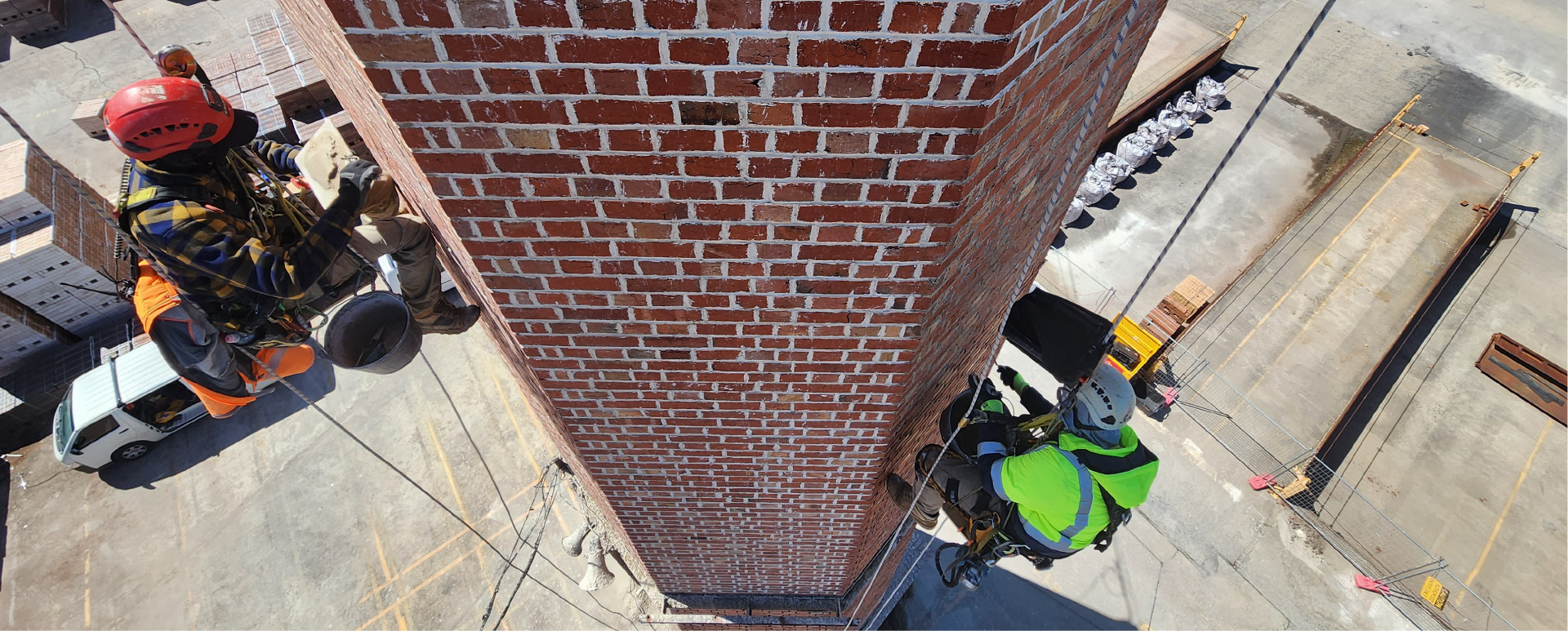 A survey and engineering report had established the chimney remained structurally sound but with gravitational hazards posed by concerning areas of loose and displaced masonry and significant deterioration of mortar joints. Spire was contracted to undertake rectification works